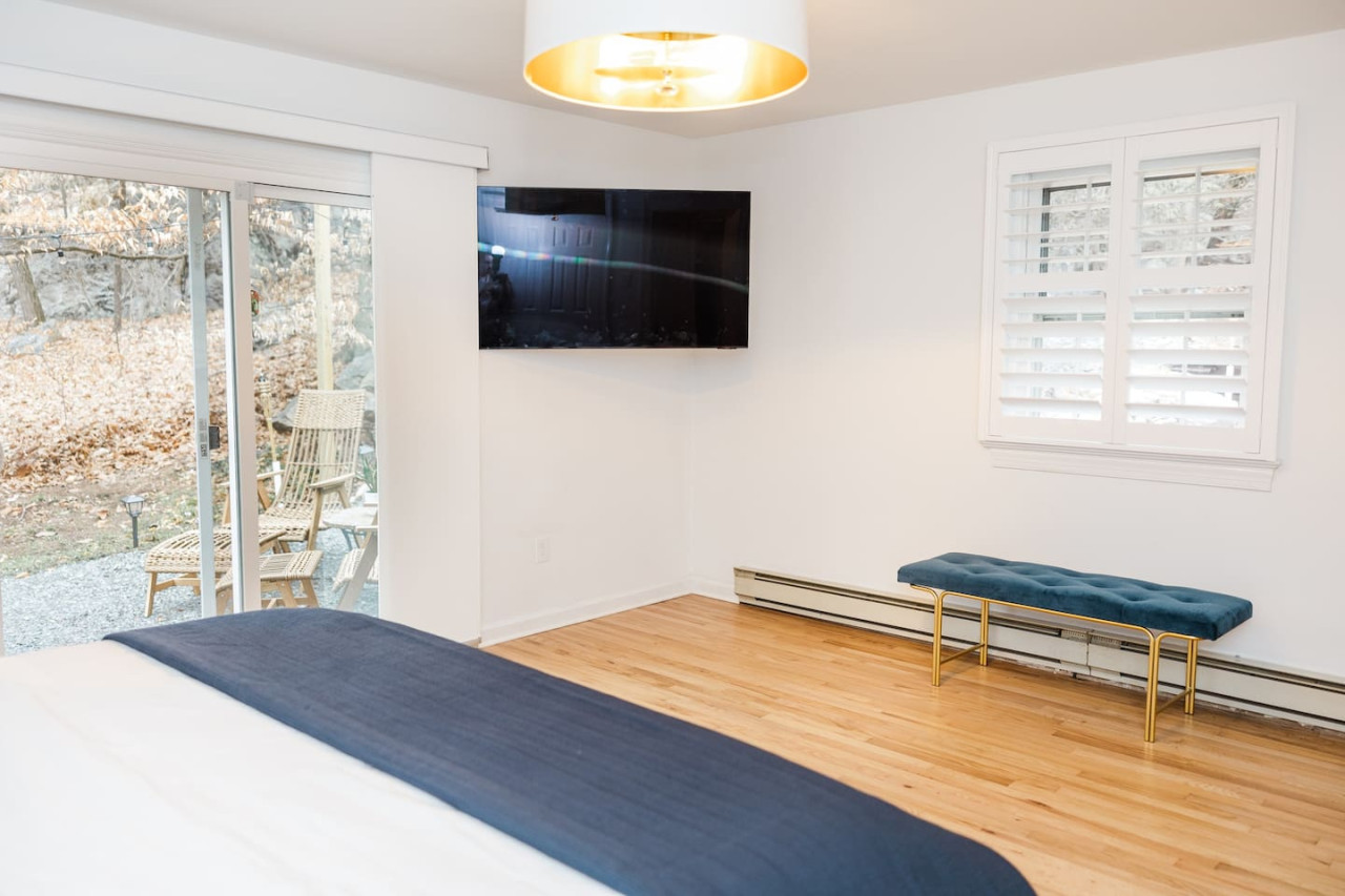 Welcome to Cowry Acres – A Secluded Luxury Retreat in New Hope Escape the ordinary and discover Cowry Acres, a private 11-acre sanctuary nestled in the shadow of Buckingham Mountain. Tucked away at the end of a private drive, this stunning villa is the perfect balance of rustic charm and modern luxury. Whether you're planning a romantic getaway, a family retreat, or a friends' reunion, Cowry Acres offers an unforgettable experience that blends nature, relaxation, and adventure. From the moment you arrive, the stress of daily life melts away. Towering trees surround you, the scent of fresh mountain air fills your lungs, and the peaceful silence is only broken by the sounds of nature. A place where you can unwind in the warmth of a bubbling hot tub, sip wine by the outdoor fireplace, or gather inside around the grand indoor hearth. Cowry Acres is more than a vacation rental—it’s an escape into a world of tranquility, comfort, and connection. The Villa – A Masterpiece of Comfort and Style Designed for both relaxation and entertainment, this thoughtfully curated home offers a perfect blend of space, comfort, and elegance. Every detail has been carefully chosen to ensure a luxurious stay. ✓ Two beautiful bedrooms designed for comfort and privacy ✓ One full bathrooms stocked with premium towels and toiletries ✓ Expansive private deck with a hot tub and breathtaking mountain views ✓ Outdoor fireplace and seating for cozy evenings under the stars ✓ Spacious indoor living area with vaulted ceilings and a grand fireplace ✓ Dedicated workspace with high-speed WiFi for remote work or streaming Unwind in Pure Relaxation – Hot Tub & Outdoor Escape Step onto the private deck and let nature embrace you. ✓ A luxurious hot tub under a canopy of stars—the perfect place to soak away stress ✓ An outdoor fireplace surrounded by plush seating—ideal for fireside chats and storytelling ✓ A sprawling patio with peaceful views of the surrounding forest—a perfect spot for coffee at sunrise or wine at sunset ✓ Towering trees and mountain views—nature’s own masterpiece, right outside your door At Cowry Acres, the outside world fades away. Whether you're unwinding after a long day of exploring or starting your morning in the crisp mountain air, this outdoor oasis is your own private sanctuary. Fireside Comfort – Indoor & Outdoor Hearths There’s something special about the glow of a fire—especially when it’s enjoyed from the comfort of a beautifully designed home. ✓ A stunning indoor fireplace that sets the perfect mood for cozy nights in ✓ An outdoor stone fireplace, where warmth meets wilderness ✓ Chic, comfortable seating in both spaces for gathering, reminiscing, and relaxing Whether it’s a romantic evening, a family game night, or simply a moment of solitude, the fires of Cowry Acres invite you to slow down and savor the moment. The Ultimate Movie Night Experience Unwind in your very own private movie room, designed for the perfect cinematic escape. Whether you're gathering for a family film, an epic binge-watch session, or a cozy night in, this space offers theater-like entertainment without leaving the villa. ✓ Large projector screen for an immersive viewing experience ✓ Plush seating for maximum comfort ✓ Surround sound audio to bring every scene to life ✓ Streaming-ready setup—just log in and watch ✓ Cozy ambiance perfect for late-night movies or rainy-day marathons From action-packed blockbusters to classic favorites, this dedicated movie space turns any night into an unforgettable experience. Grab your popcorn, dim the lights, and enjoy the show! Rest in Unmatched Comfort – Three Thoughtfully Designed Bedrooms Sleep is sacred, and at Cowry Acres, every bedroom is crafted for rest, relaxation, and rejuvenation. ✓ Executive Suite – A private upstairs retreat with a king-size bed, a queen sofa bed, an en-suite full bathroom, and a private fireplace ✓ Superior Guest Room – A spacious haven with a king-size bed, a king sofa bed, and a full bathroom right outside the door ✓ Guest Room – A cozy, inviting space with a queen sofa bed and its own fireplace for added warmth and charm Each room is outfitted with plush bedding, soft linens, and a peaceful atmosphere that ensures a deep, restful sleep. A Kitchen Designed for Gatherings Food brings people together, and the kitchen at Cowry Acres is designed to make every meal an experience. ✓ Fully equipped with premium appliances, cookware, and dining essentials ✓ Spacious countertops and an open-concept layout for easy meal prep ✓ Indoor and outdoor dining spaces for intimate breakfasts or festive dinners ✓ A coffee station to kick-start your mornings with the perfect brew Whether you’re cooking a homemade meal, ordering in from a local favorite, or gathering for a toast, this space is designed for connection and celebration. Adventure Awaits – Explore the Best of New Hope While Cowry Acres feels like a secluded retreat, it's just minutes from the best attractions New Hope has to offer. ✓ Peddler’s Village – A charming shopping and dining experience with seasonal festivals ✓ Lambertville & Doylestown – Explore historic towns filled with culture, art, and local flavors ✓ Scenic Hiking & Nature Trails – Adventure through breathtaking landscapes just steps from your door ✓ Wineries & Breweries – Discover some of the finest local wines and craft beers ✓ Delaware River Towns – Stroll along the waterfront, enjoy riverfront dining, and take in the historic charm From outdoor adventures to boutique shopping and gourmet dining, Cowry Acres places you at the center of it all—without sacrificing the peace and privacy you crave. Designed for Every Season Cowry Acres is a year-round destination, offering something magical in every season. ✓ Spring & Summer – Blooming wildflowers, perfect weather for outdoor dining, and lush greenery surrounding the villa ✓ Autum